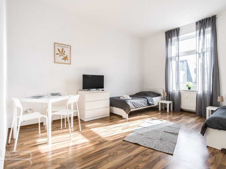 Die Wohnung verfügt über zwei großzügige Schlafzimmer, eine separate Küche mit gemütlichem Essbereich sowie ein frisch modernisiertes Badezimmer. Helle Räume, ein durchdachter Grundriss und der charmante Altbauflair machen dieses Zuhause ideal für Singles oder Pendler, die Wert auf Stil und Komfort legen.